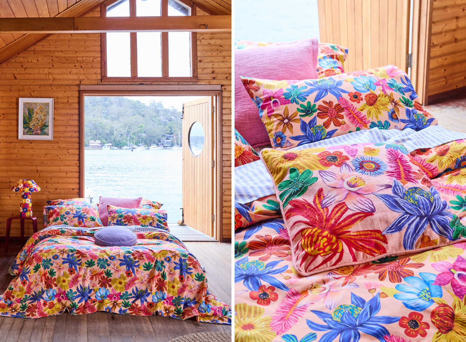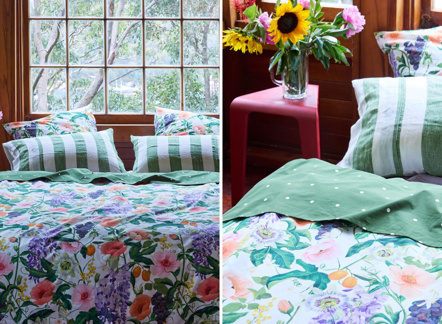 Wild Flowers In Bloom and Seaside Stripe, go big or go back to bed. Wild Flowers In Bloom is a colour explosion- joyful, juicy, and impossible to ignore. Throw in a splash of Seaside Stripe and boom! You’ve got yourself a bed that feels like a beachside gelato stand (minus the melting).