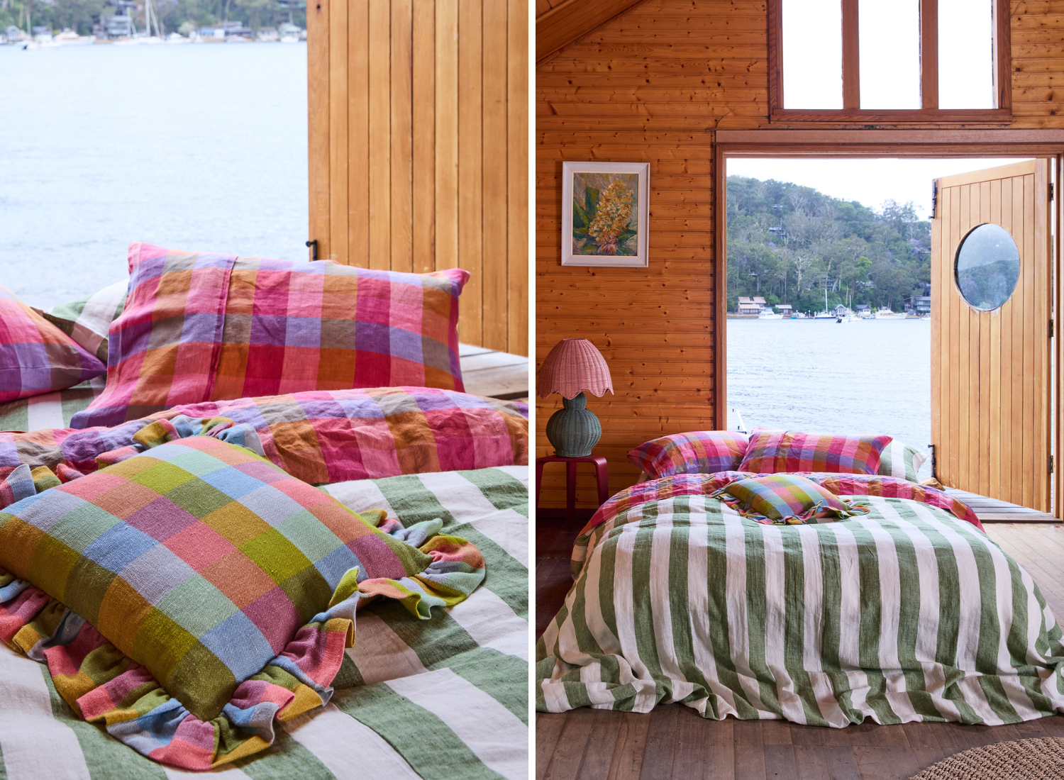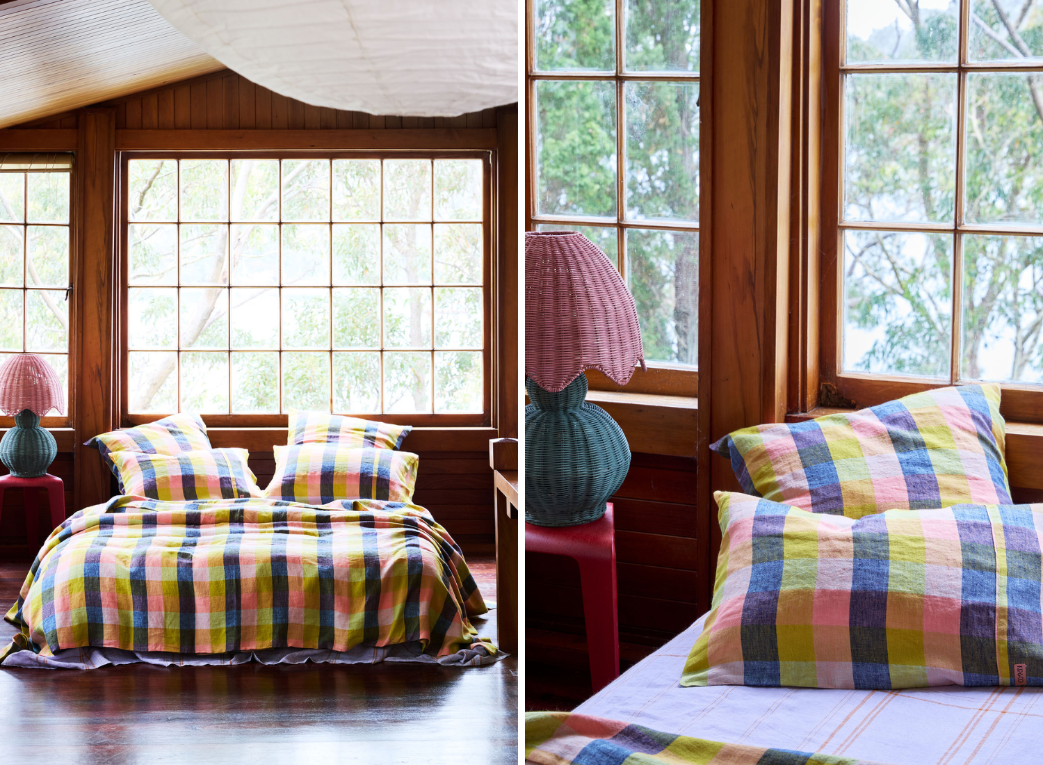 Florida Tartan and Santa Monica Tartan, double tartan, double trouble. Florida Tartan brings retro sunshine vibes in golden linen, and when you pair it with the bold contrast of Santa Monica, it’s a pattern party and your bed’s the guest of honour.