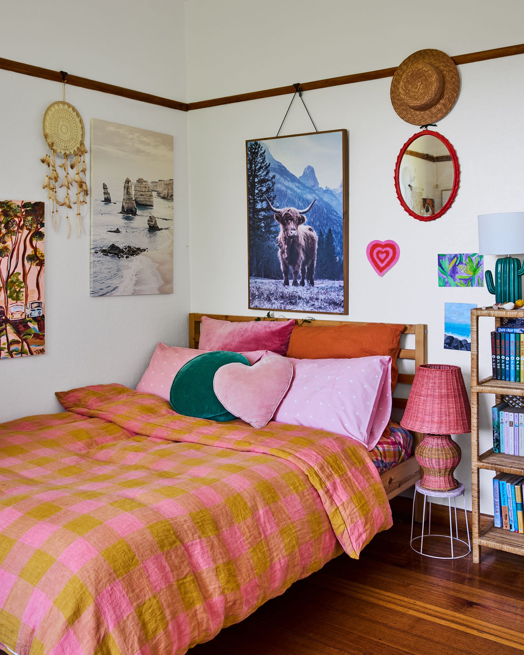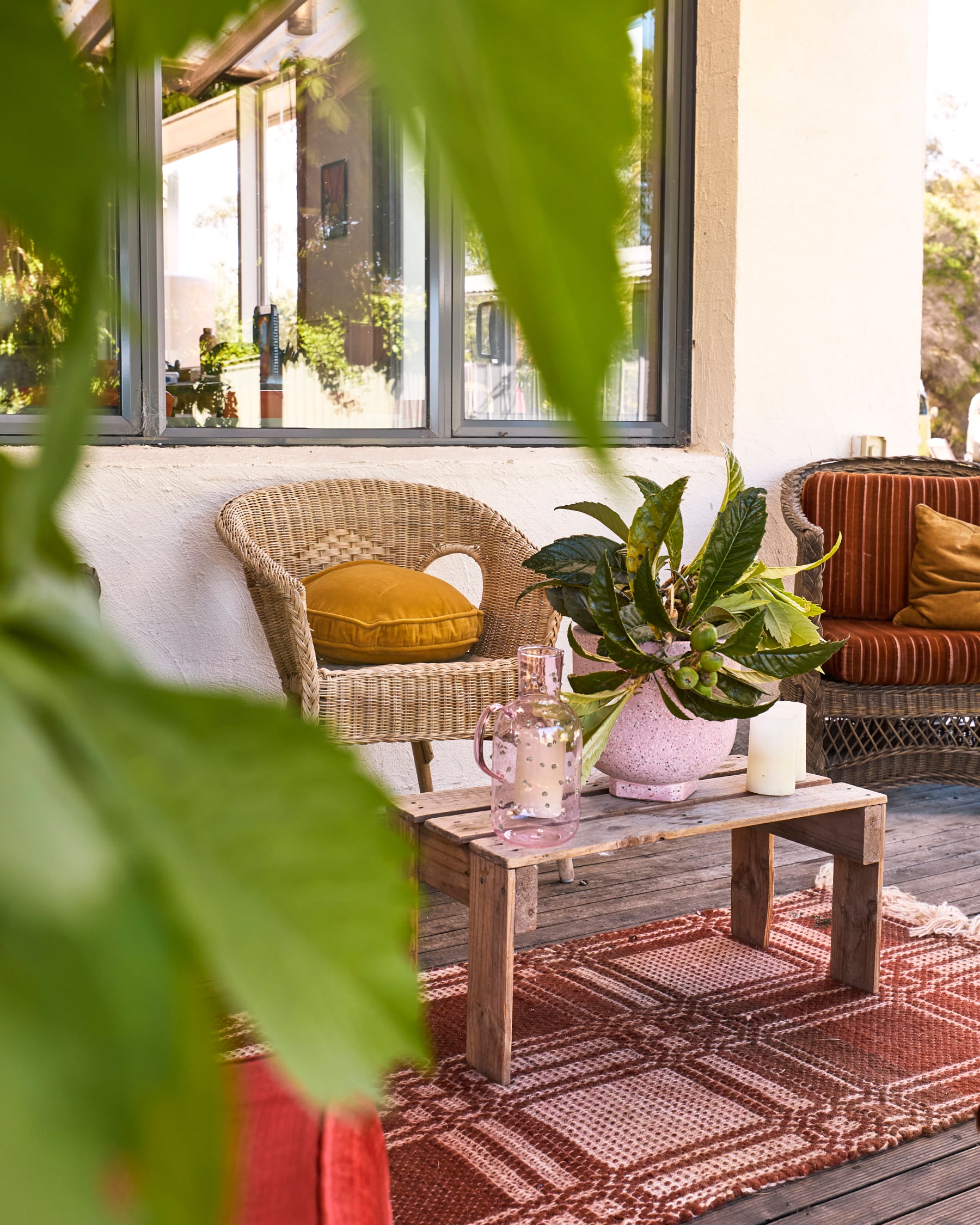 I get a real kick out of coming across things I love randomly, bringing them home, and finding a place for them. I used to love visiting my great-aunty and uncle's homes when I was little; they felt so homely and full of colour with their blankets, little pictures on the walls, and peacocks around the home. They just felt like joyful little bits and bobs, so I think about them often and love that. I move things around unconsciously in the different seasons and add different colours to suit the weather and colours outside. In winter, I love adding the Kip velvet quilt in the rooms to make them feel cosy, and the colours are uplifting. While in summer, I love the feeling of the bamboo on our beach bums. Haha. Cord, velvet, florals, oranges, greens, pinks, yellows—I love it all!