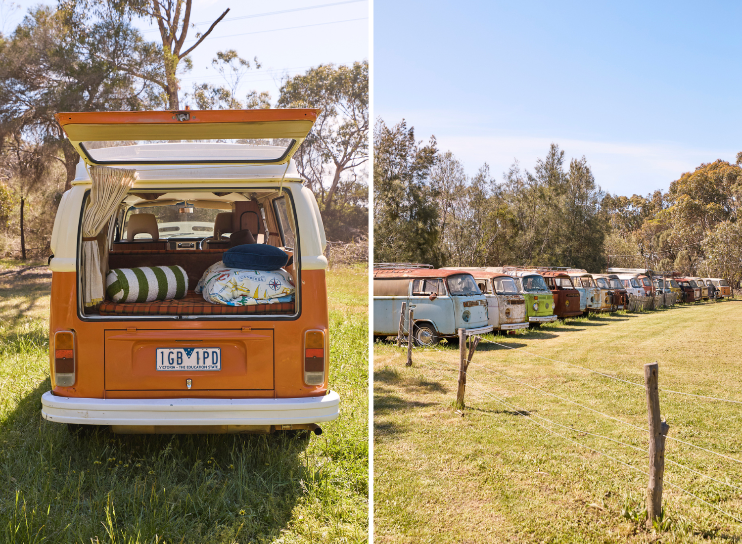 We operate from the Bellarine Peninsula, Victoria, on a sweet 5 acres that we are so grateful, every day, to call home. In 2012 we started Hire A Kombi, which is now the longest operating self-drive Kombi hire company in Australia. We currently offer 5 automatic original 1970s VW Kombis for camping, day trips, weddings, photoshoots, marketing, chauffeuring, and this is so exciting for us to share with you because we actually haven’t even officially announced it yet, but we have just added a Kombi hearse to the fleet, which George has built from scratch. This has been 10 years in the making (it’s quicker to build a home than restore a Kombi).