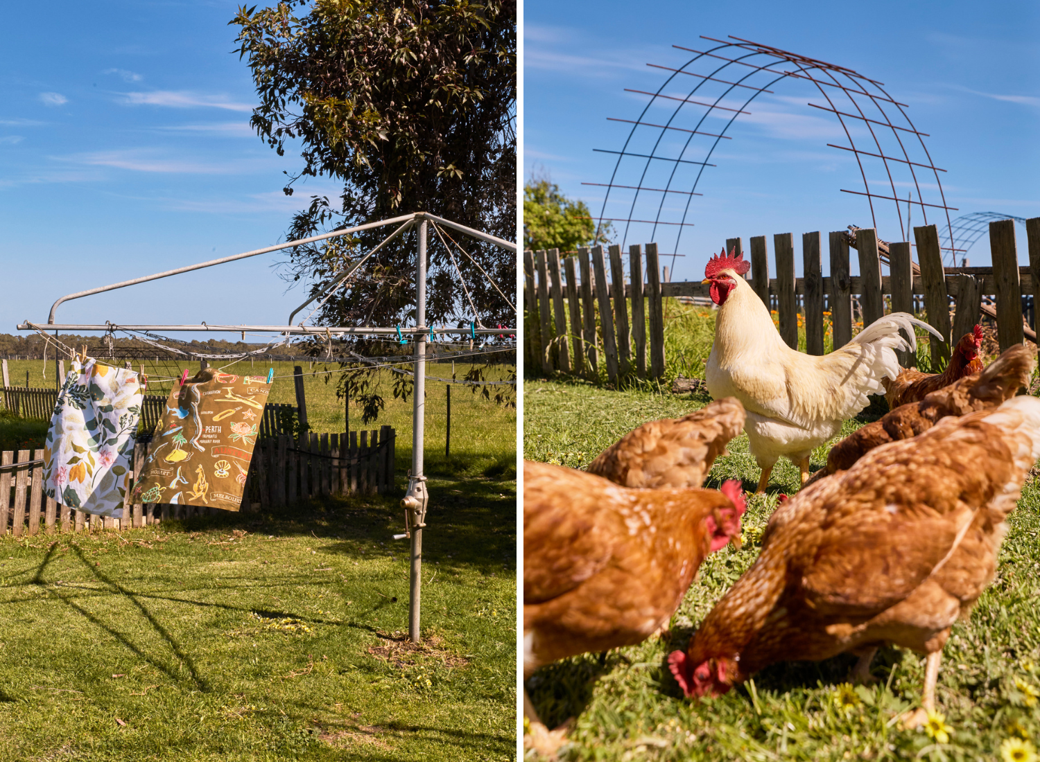 Every morning we have our coffee on the deck and a cuppa at night. It’s something George and I have done together ever since we moved here, and it’s one of our family’s favourite areas to hang out. I grew up on the land and spent a lot of time outside with the animals, and I found them so relaxing, and I still, as a 40-year-old, get that same peaceful, grounding feeling watching them and having their energy in our space.