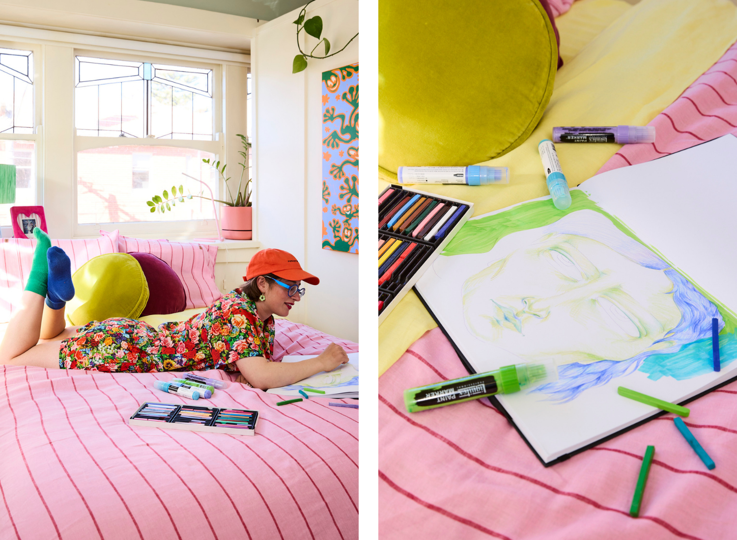 This time, we’re pulling back the doona with the brilliant Giulia Giannini McGauran, or GG McG, as she’s better known. A 3x ARIA-nominated creative director and photographer, Giulia’s work is a riot of colour, character and play. She’s captured iconic moments with everyone from The Wiggles to Crowded House (yep, her Rolling Stone covers even won Cover of the Year, twice!) and brought brands like Disney, Spotify and New Balance to life with her bold vision.