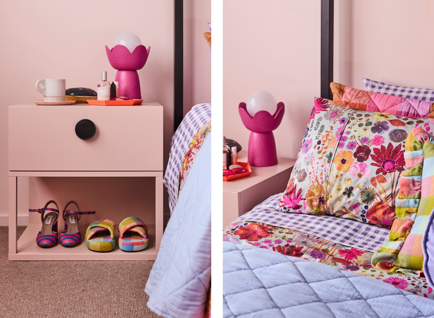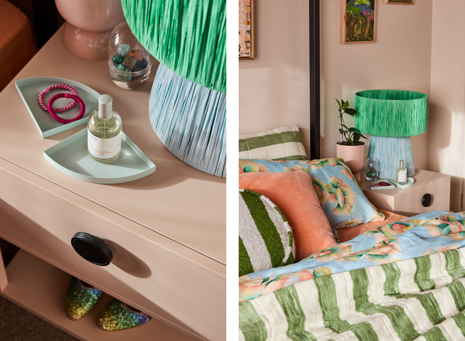 A favourite photo of my mum, who we lost just over a year ago, along with her rings. They’re a daily reminder of her love and strength. There’s also a colourful little tray that catches whatever jewellery or hair ties I’ve taken off at the end of the day, the latest book I’m dipping into, my glasses, and my favourite perfume. A notebook also sits close by for those inevitable late-night ideas. And if I’m honest, whatever shoes I’ve kicked off usually end up at the base.