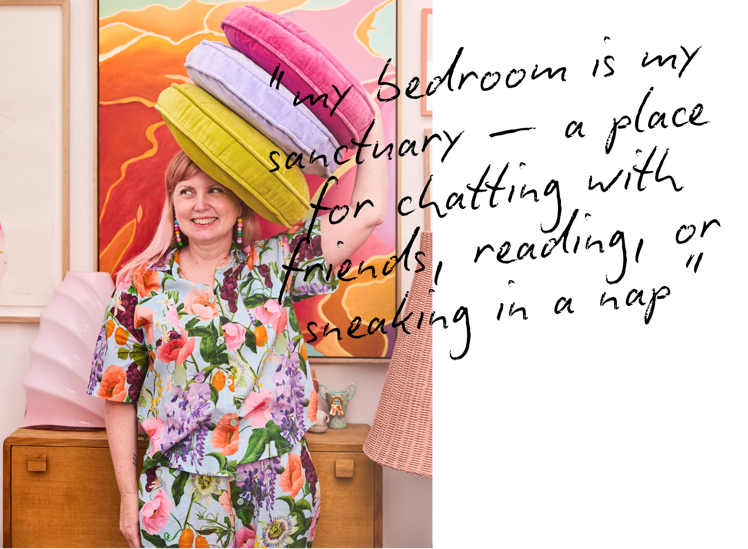 It always comes back to making it personal. I love layering textures and creating a space that feels lived in and loved, not staged for show. A bedroom should hold pieces of your story, whether that’s a much-loved artwork, a vintage treasure you’ve carried with you, or even a colour that sparks a memory. I like to mix textiles, patterns and objects that speak to the person and the space, so everything feels connected and intentional. And controversially, I’m not a cushion chopper. I much prefer them to fall in their natural, relaxed way. When a space reflects you honestly and brings you joy, it will always feel effortlessly styled.