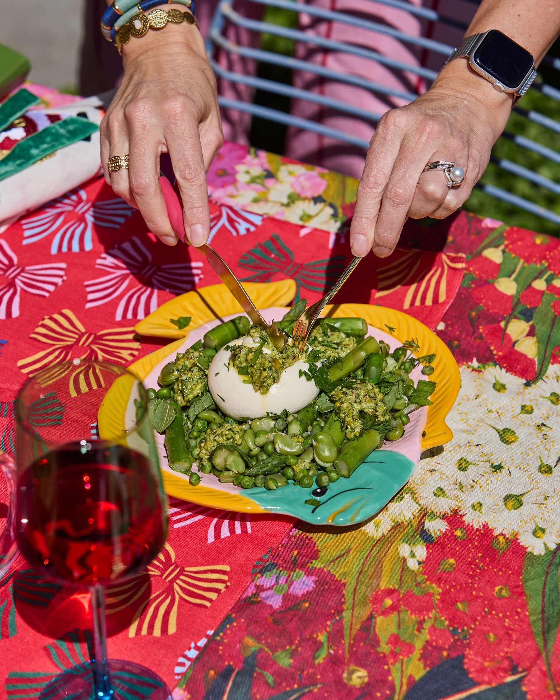 "Burrata is the sort of cheese you can make a meal out of, which makes it extremely useful as well as being utterly delicious. Creamy and delicate, but also rich and filling, it forms an impressive lily-white globe in the centre of a plate around which you can arrange all kinds of ingredients, all of which benefit from being doused in sweet and grassy cream once the burrata is burst into with a knife. Marinated (bell) peppers, slow-cooked courgettes (zucchini), fresh spring vegetables and roasted aubergines (eggplants) all happily form a flavoursome foundation to be crowned by a creamy ball of burrata. You can then play with various toppings and dressings. Pistachio pesto works beautifully, and in this instance enhances the verdant green of the surrounding spring vegetables, but a quick olive tapenade, fresh chilli oil or anchovy dressing would be equally delicious.
