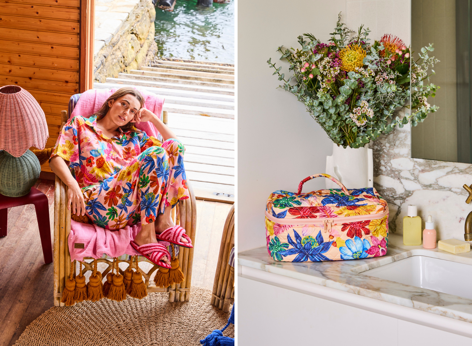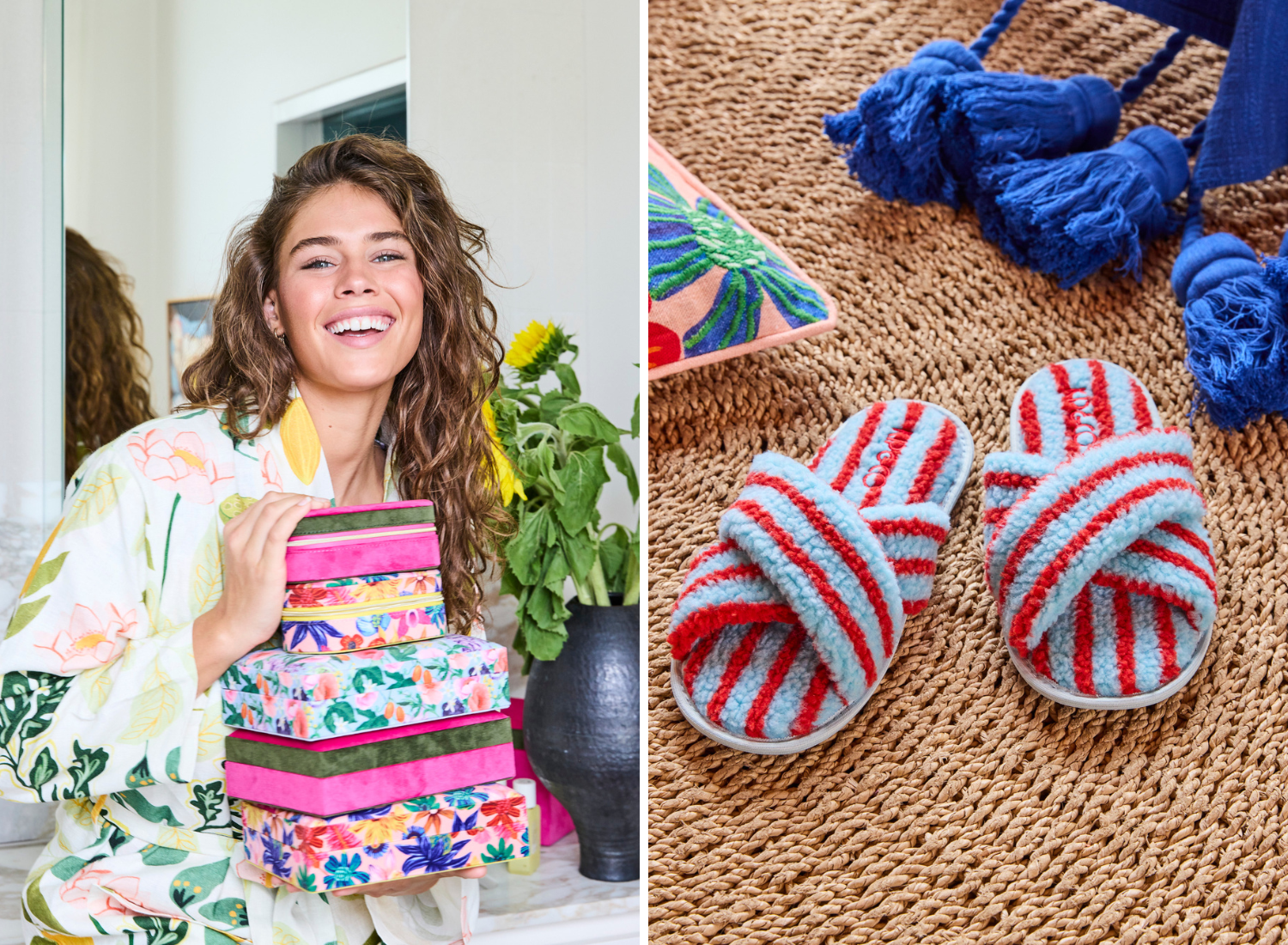 Slip into plush sherpa slippers in playful stripes or go luxe with velvet slippers in Follow The Sun and Florida Tartan. And for keeping your treasures tidy, our quilted toiletry cases and velvet jewellery boxes—decked out in Spring In The Air, Prickly Pear, and Wild Flowers In Bloom—are equal parts practical and pretty.