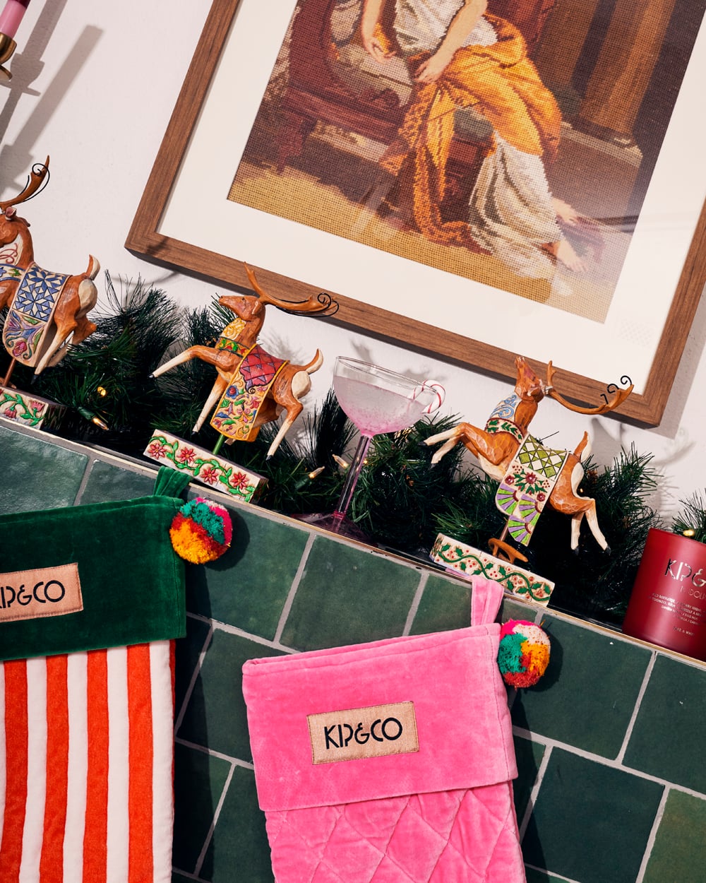 Now, my favourite thing every year is setting them up above our fireplace. Fun fact: I tiled it in green tiles so it would always match that set, because I knew it would forever have pride of place there. A few of the reindeer are missing an antler or have been glued back together over the years – and that’s exactly what makes it all the more special. It holds all those Christmas memories in it.