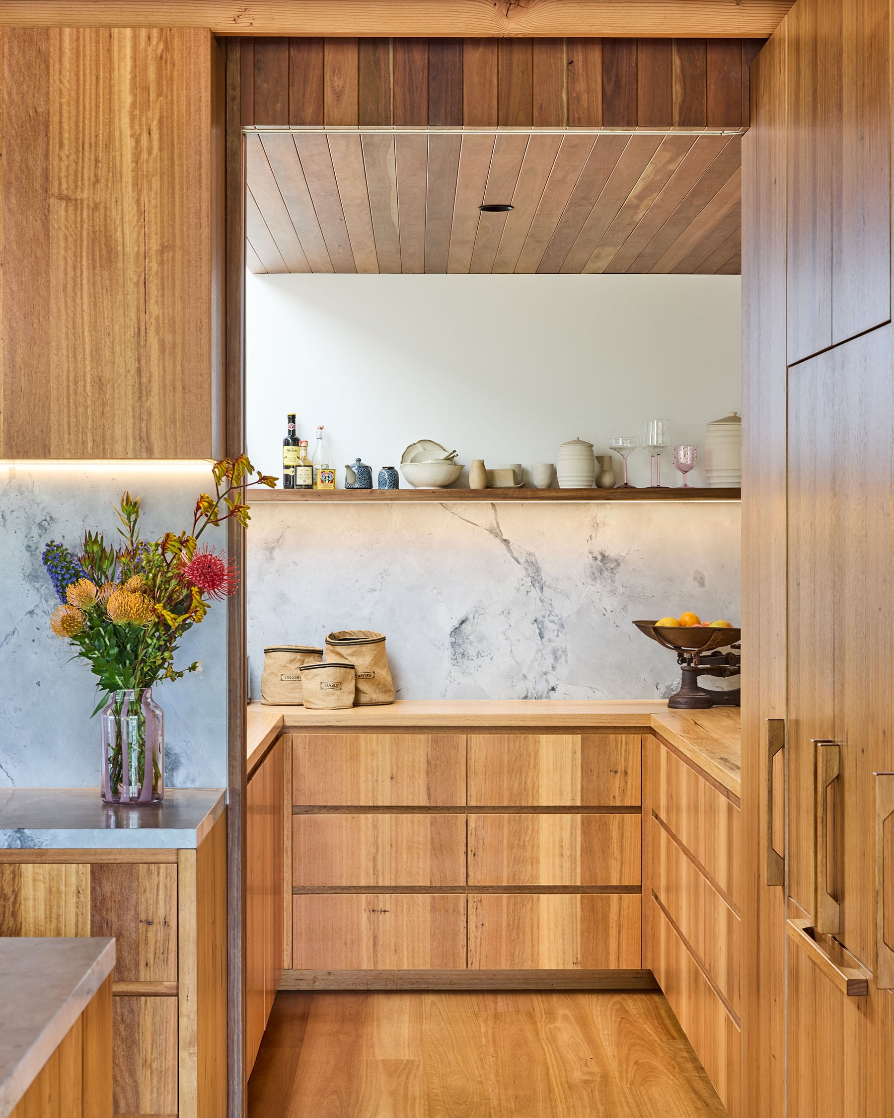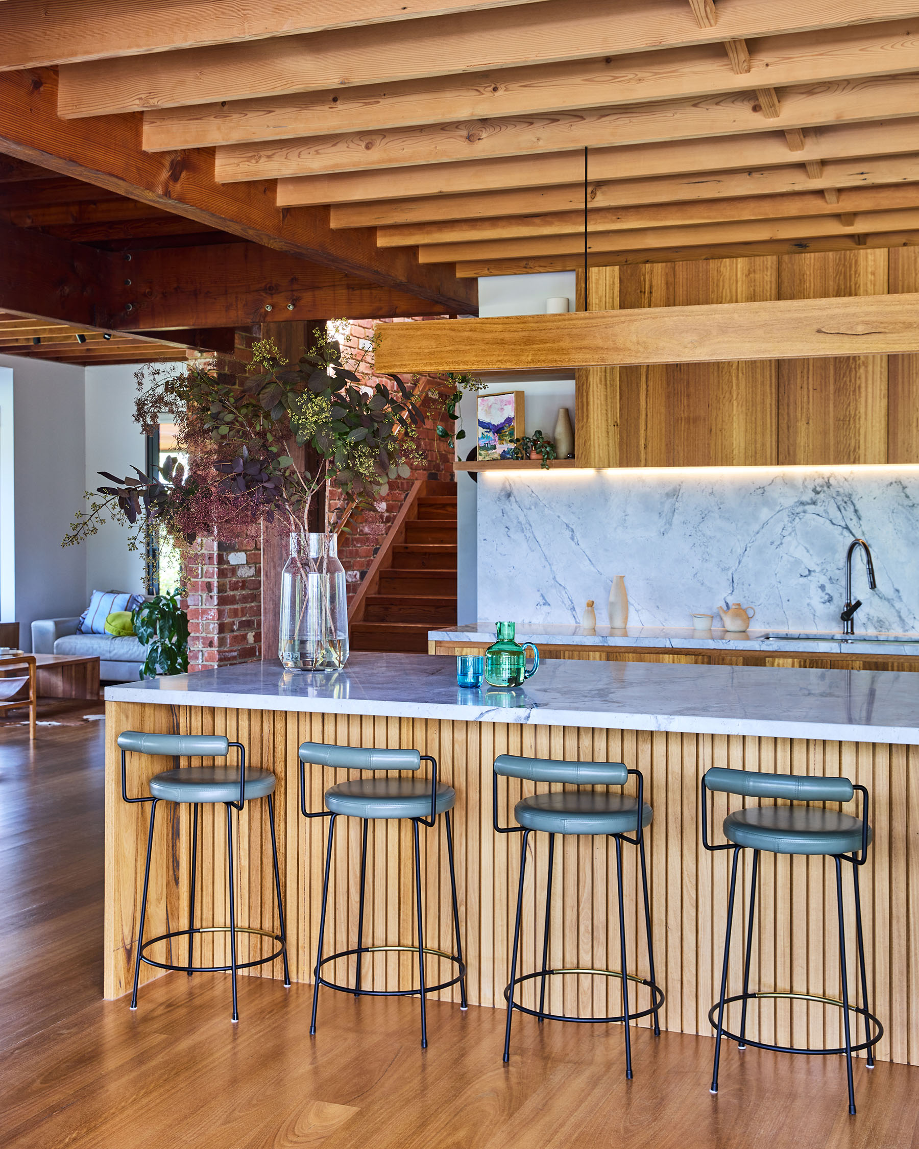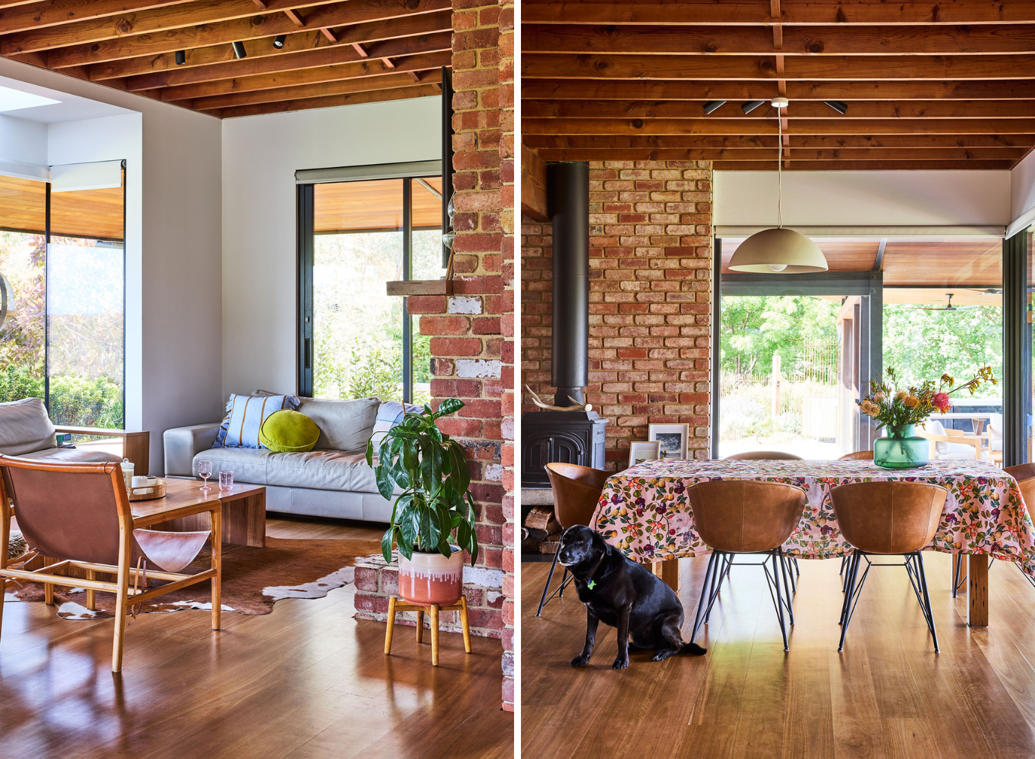 Recycled brick, timber-lined ceilings and solid blackbutt floors create a rich, textural foundation, balanced by considered renovations and landscaping that bring a sense of calm and longevity. Driven by a shared love of sustainable timber and timeless design, this is a home built to last. Keep reading to step inside this Yarra Valley haven and see how Sharn and Josh have shaped their family home.