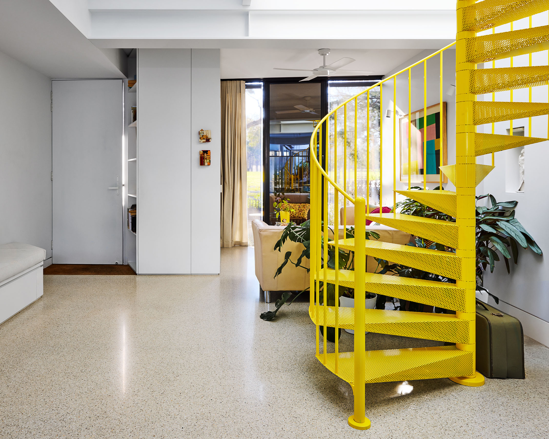 Bryan. Thank you for this question. I celebrate the many decades I have built and designed spiral staircases, but I cannot take the credit for the choice of having a bright yellow spiral staircase. I wanted a helical staircase with a glass balustrade. The inspired choice which we have here was made by my sculptor wife, which I reluctantly accepted, but every time I walk past it, I salute the decision.