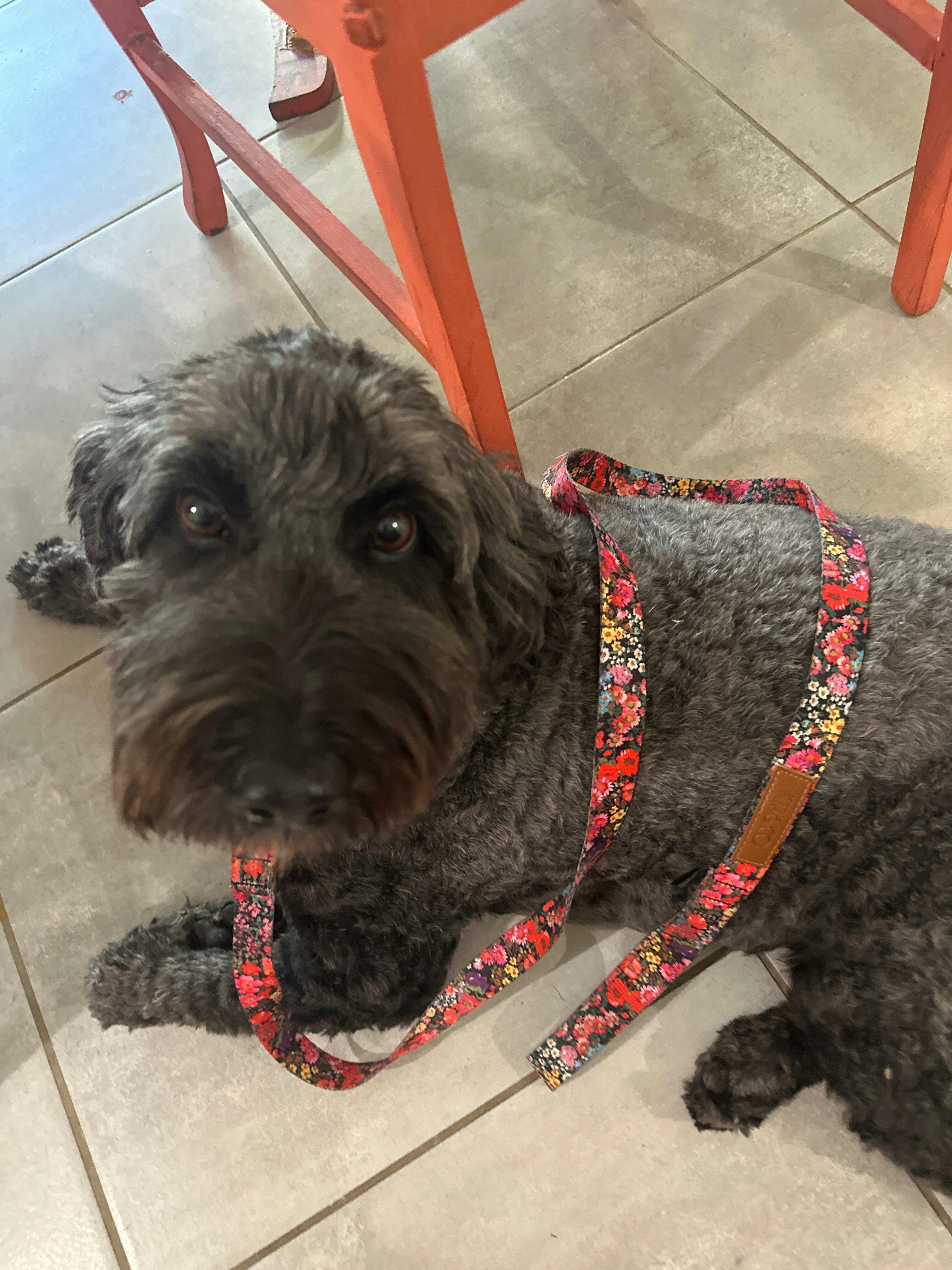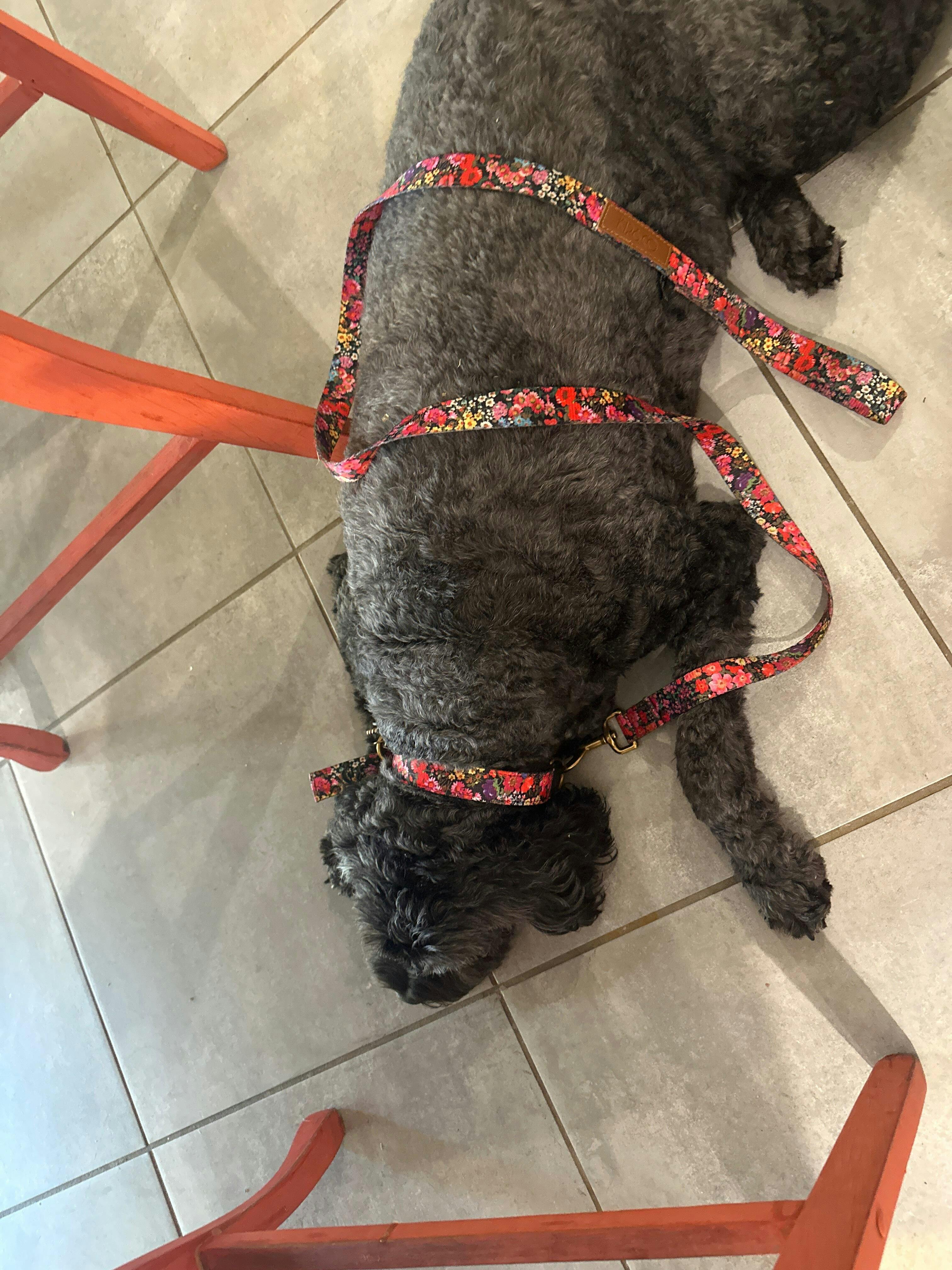 I really love this bright colour print, our dog is black and it’s hard to find pretty and bright lead and collar. I love the brass coloured fitting ms and the quality.