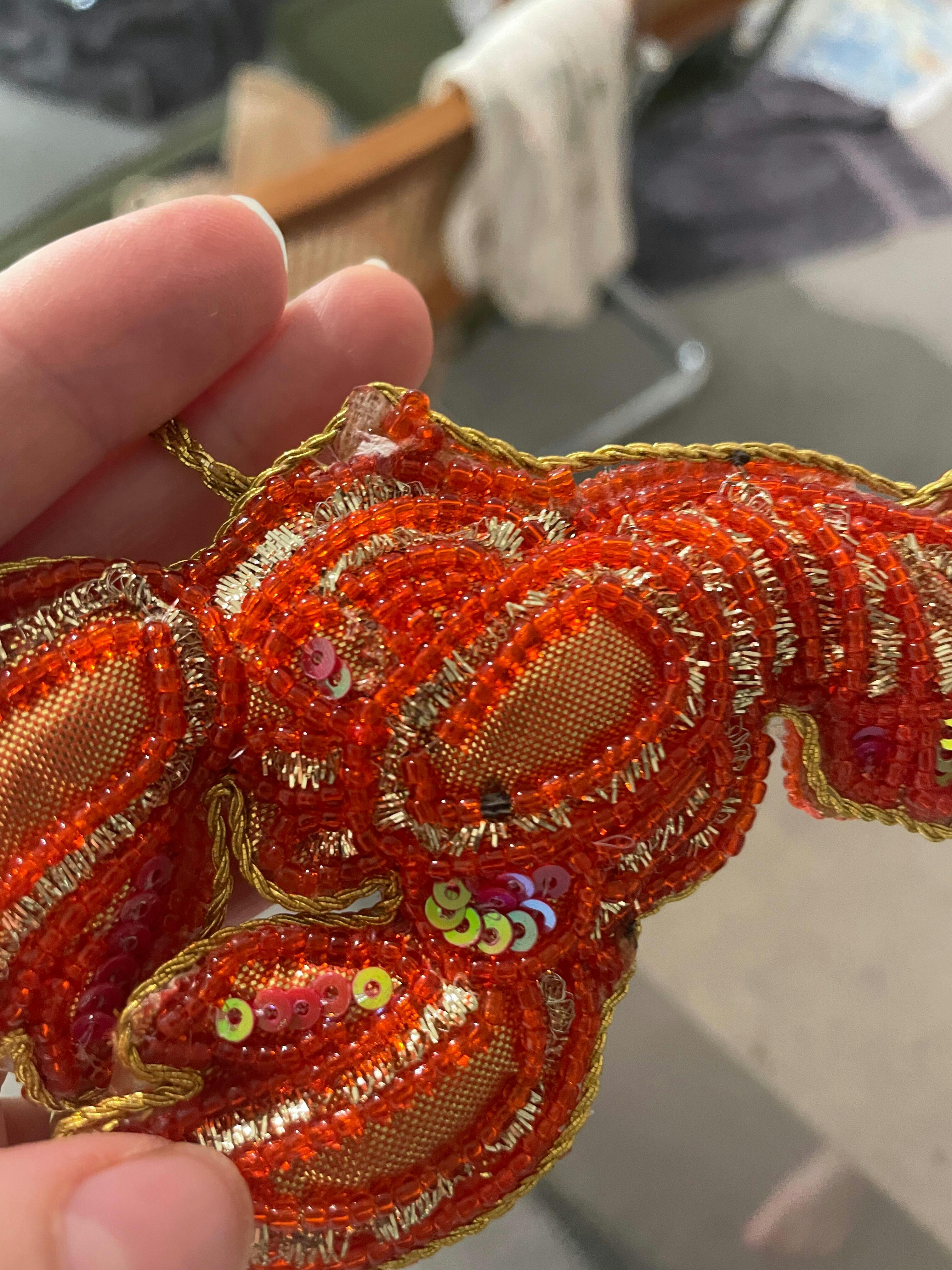 Hand beaded and sequinned. Approximately 6 cm H x 10.5 cm W.