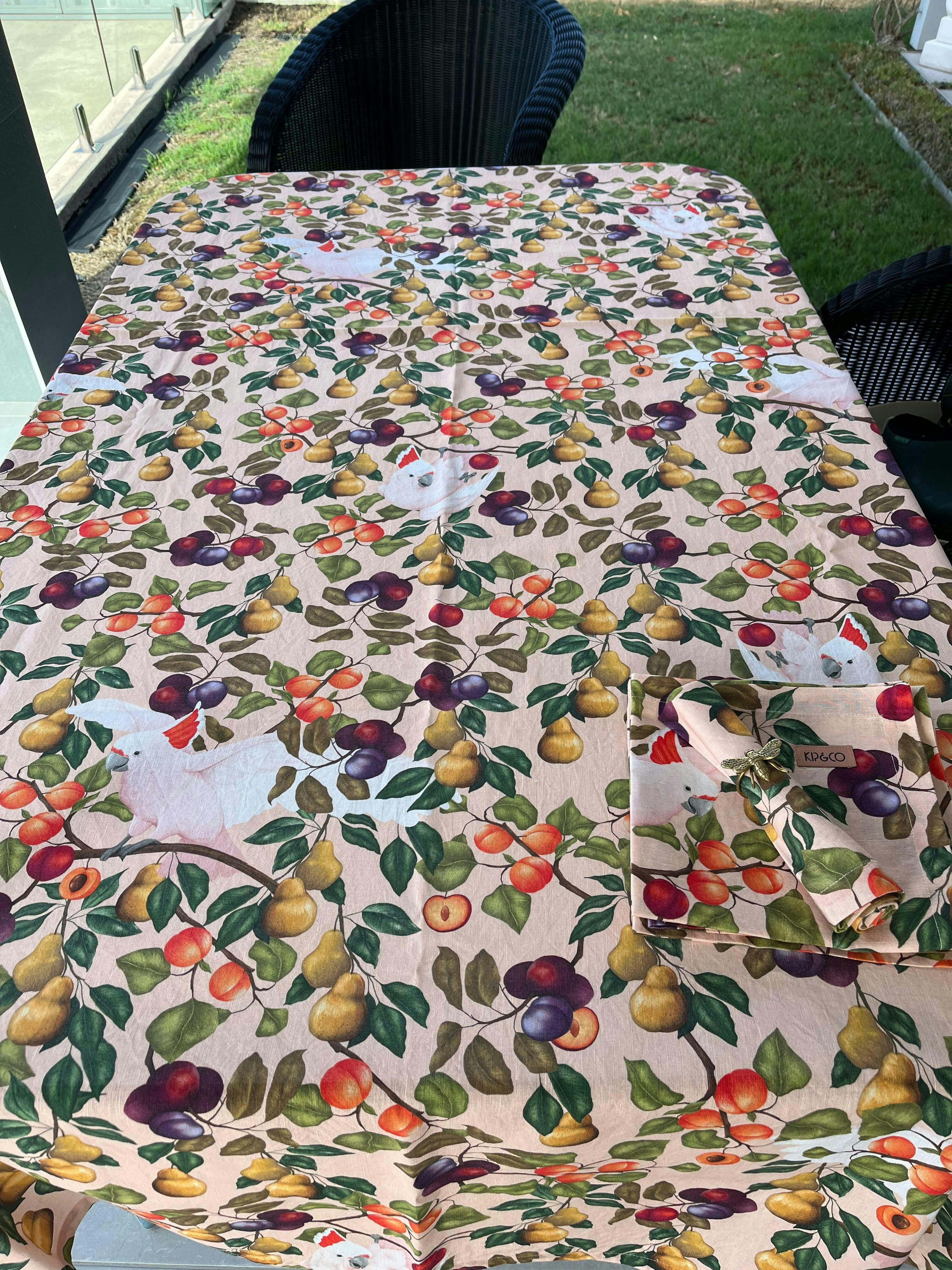 Wow! The perfect summer tablecloth, summer fruits and Major Mitchell cockatoos, what a lovely combination! Beautiful linen that washes softer each time.